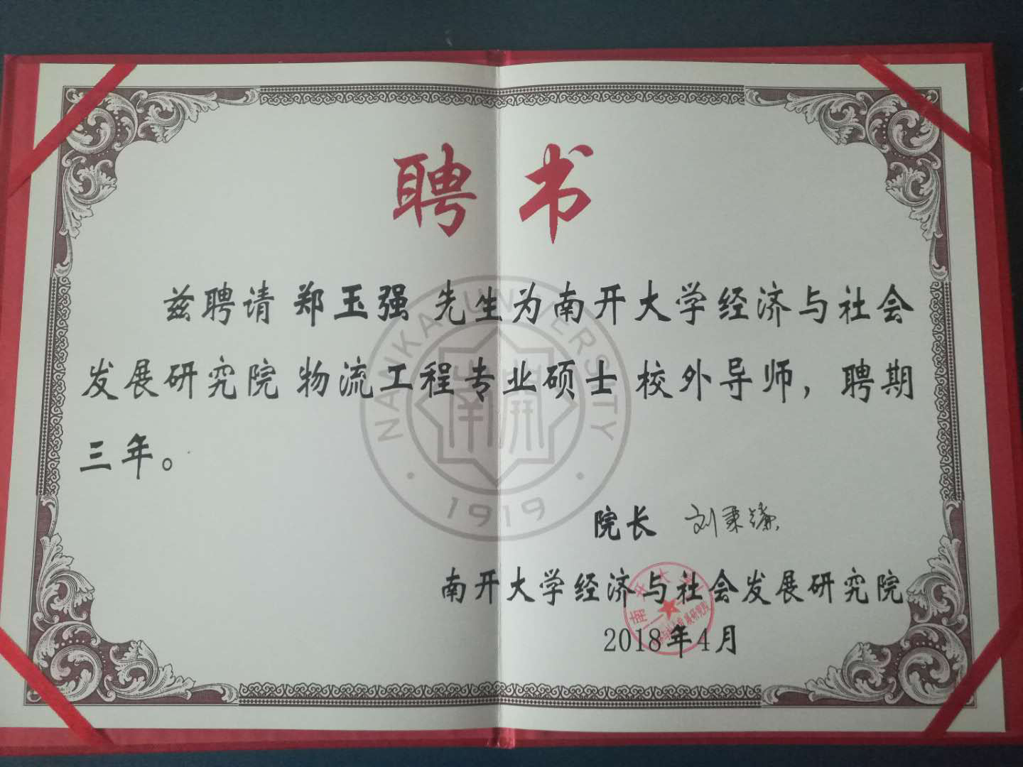 2018年4月27日,南開大學經(jīng)濟與與社會研究院院長劉秉廉教授向鄭玉強頒發(fā)聘書,聘請鄭玉強為研究院物流工程專業(yè)碩士校外導師,聘期為三年。
