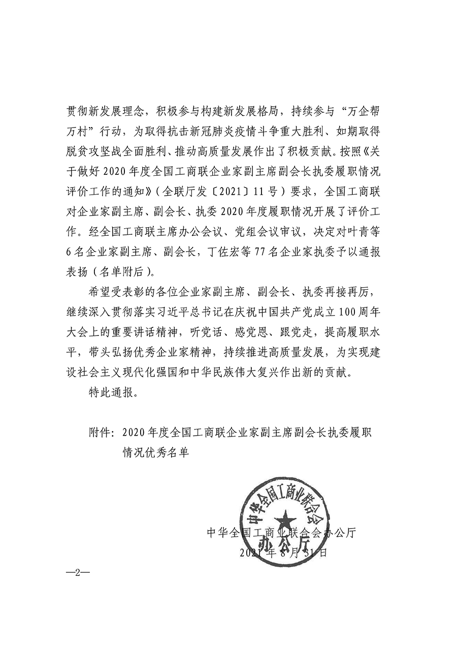 近日,全國工商聯(lián)發(fā)布《關(guān)于對2020年度履職情況優(yōu)秀的全國工商聯(lián)企業(yè)家副主席副會長執(zhí)委給予表揚的通報》。《通報》指出,2020年度面對突如其來的新冠肺炎疫情沖擊影響,各位企業(yè)家副主席、副會長、執(zhí)委認真學(xué)習(xí)貫徹習(xí)近平新時代中國特色社會主義思想,以實際行動響應(yīng)中央號召,積極投身抗擊疫情狙擊戰(zhàn),統(tǒng)籌做好疫情防控和復(fù)工復(fù)產(chǎn),主要服務(wù)“六穩(wěn)”“六保”,認真貫徹新發(fā)展理念,積極參與構(gòu)建新發(fā)展格局,持續(xù)參與“萬企幫萬村”行動,為取得抗擊新冠肺炎疫情斗爭重大勝利、如期取得脫貧攻堅戰(zhàn)全面勝利、推動高質(zhì)量發(fā)展作出了積極貢獻。按照《關(guān)于做好2020年度全國工商聯(lián)企業(yè)家副主席副會長執(zhí)委履職情況評價工作的通知》要求,全國工商聯(lián)對企業(yè)家、副主席、副會長、執(zhí)委2020年度履職情況開展了評價工作。經(jīng)全國工商聯(lián)主席辦公室會議、黨組會議審議,決定對葉青等6名企業(yè)家副主席、副會長,丁佐宏等77名企業(yè)家執(zhí)委予以通報表揚。