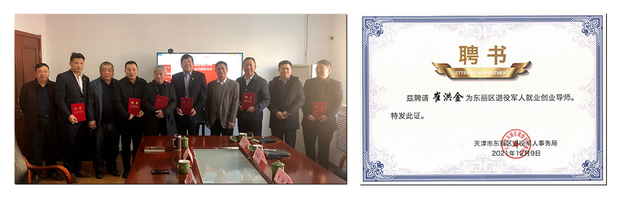 崔洪金董事長(zhǎng)獲得區(qū)退役軍人事務(wù)局頒發(fā)的就業(yè)創(chuàng)業(yè)導(dǎo)師證書