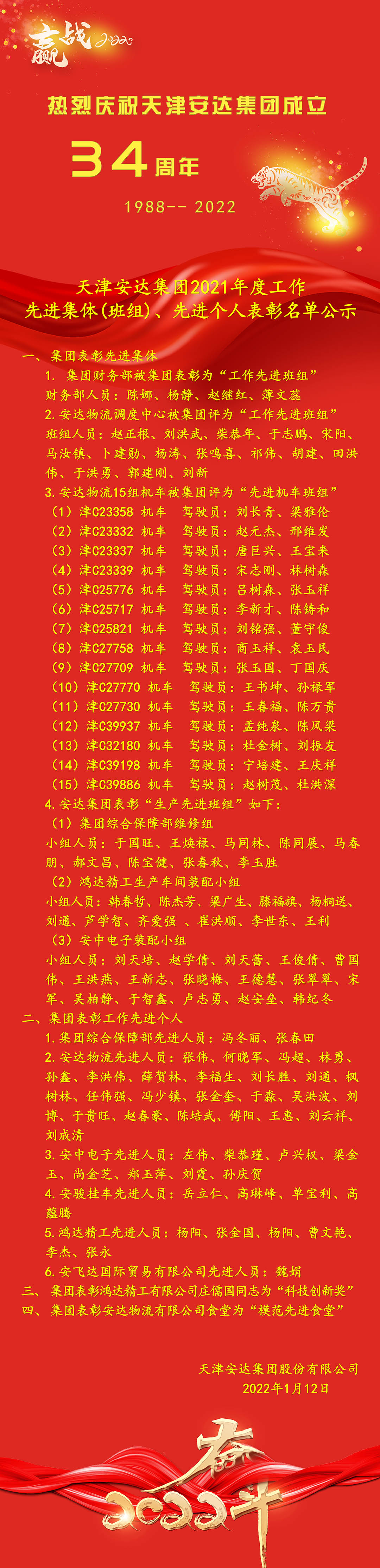 現(xiàn)將表彰的先進(jìn)集體和先進(jìn)個人進(jìn)行公示,望所有受表彰人員能夠再接再勵,再創(chuàng)佳績。展望2022年,將是強(qiáng)化改革、戰(zhàn)勝疫情的轉(zhuǎn)折之年,更是夯實(shí)基礎(chǔ)、強(qiáng)力發(fā)展的關(guān)鍵之年。安達(dá)集團(tuán)將面臨機(jī)遇,迎接挑戰(zhàn),希望廣大黨員和職工群眾團(tuán)結(jié)一致、緊抓機(jī)遇,激勵斗志、提高效益,結(jié)合國家發(fā)展戰(zhàn)略,促進(jìn)企業(yè)穩(wěn)步發(fā)展。