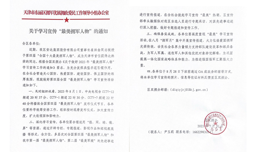 8月1日在建軍96周年之際及紀(jì)念延安雙擁運(yùn)動(dòng)80周年,央視法治頻道播出了《閃亮的名字-2023年最美擁軍人物發(fā)布儀式》,本次活動(dòng)旨在深入學(xué)習(xí)貫徹習(xí)近平新時(shí)代中國(guó)特色社會(huì)主義思想和黨的二十大精神,深入貫徹落實(shí)習(xí)近平總書(shū)記關(guān)于雙擁工作重要論述,發(fā)揮先進(jìn)典型示范引領(lǐng)作用,在全社會(huì)營(yíng)造關(guān)心國(guó)防、熱愛(ài)國(guó)防、建設(shè)國(guó)防、保衛(wèi)國(guó)防的濃厚氛圍,中共中央宣傳部、退役軍人事務(wù)部、中央軍委政治工作部、全國(guó)雙擁辦聯(lián)合發(fā)布“最美擁軍人物”先進(jìn)事跡。安達(dá)集團(tuán)黨委書(shū)記、董事長(zhǎng)崔洪金獲得2023年全國(guó)“最美擁軍人物”。