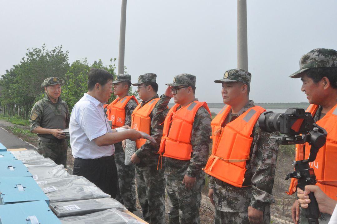 崔洪金現(xiàn)場了解民兵生活、排險情況,向堅守河堤的民兵表示崇高敬意,并為民兵送上夏季訓(xùn)練服裝和防暑降溫慰問品,對他們發(fā)揚“聞‘汛’而動、聽令而行、勇于奉獻(xiàn)”的精神高度贊揚。