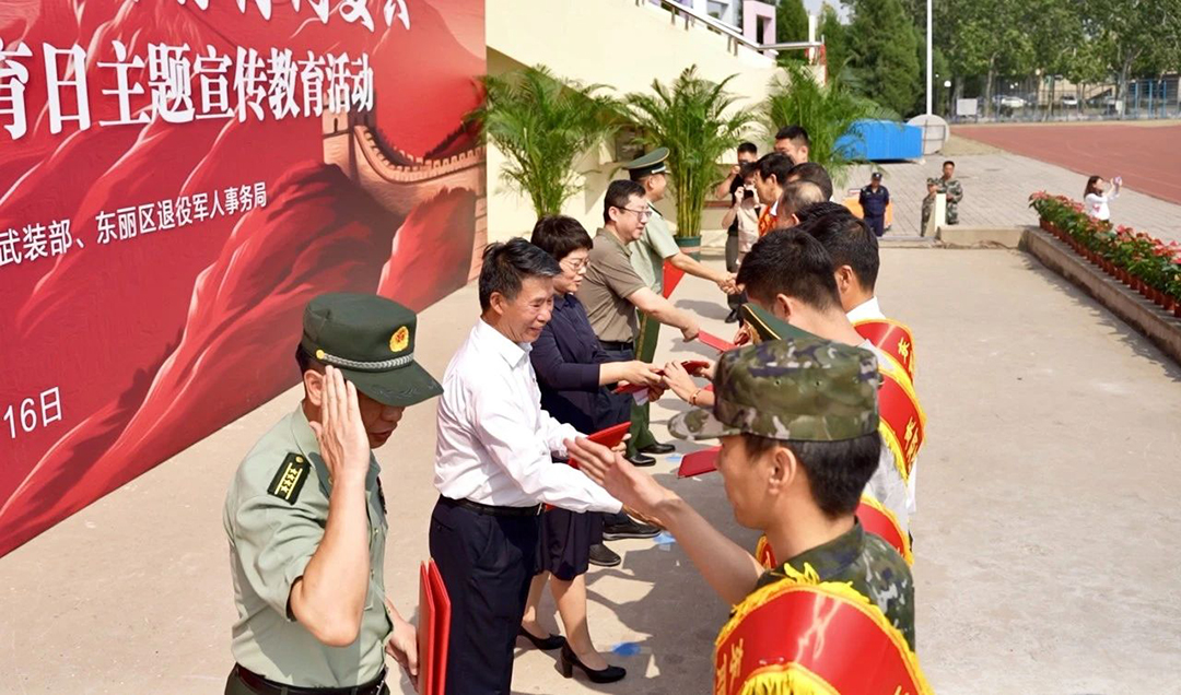 活動中,在場領導為區(qū)退役軍人事務局老兵宣講團、區(qū)“強軍理論優(yōu)秀教員”、區(qū)“最美擁軍人物”、“最美退役軍人”代表組成的東麗區(qū)全民國防教育宣講團頒發(fā)聘書。中國民航大學學生代表、典型模范代表、新立街道、退役軍人事務局相關負責人做了表態(tài)發(fā)言。