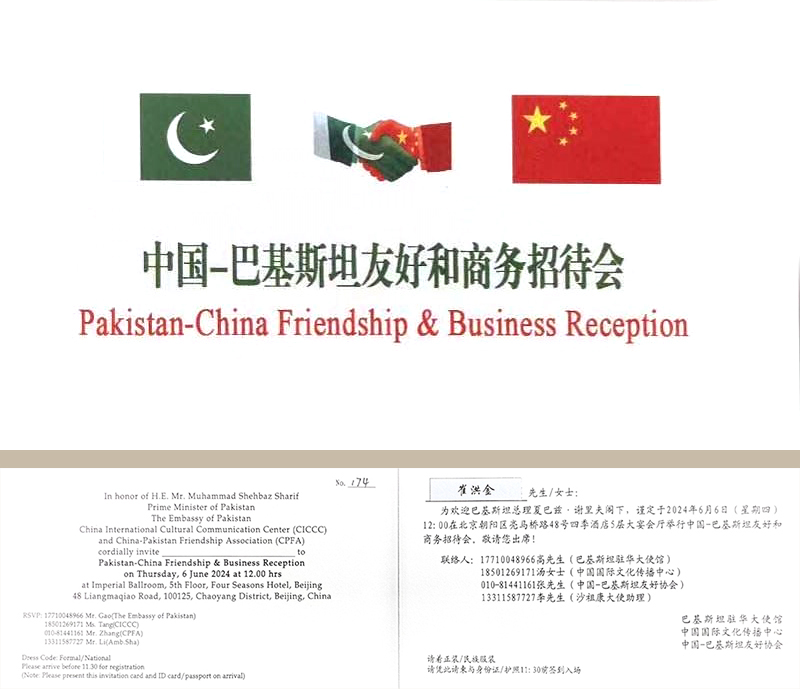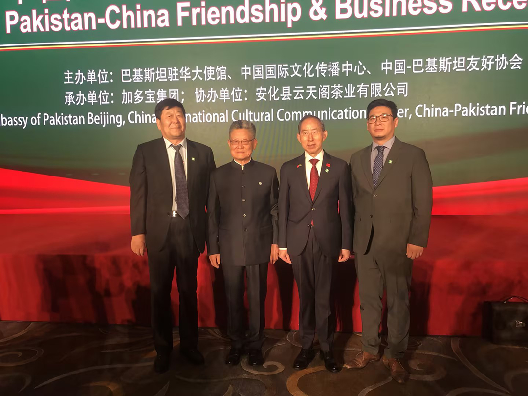 2024年6月6日,由巴基斯坦駐華使館、中國國際文化傳播中心和中國—巴基斯坦友好協(xié)會共同主辦的中國—巴基斯坦友好和商務招待會在京舉辦。正在中國訪問的巴基斯坦總理夏巴茲·謝里夫出席招待會并致辭。前聯(lián)合國副秘書長沙祖康、中國人民對外友好協(xié)會副會長李希奎、中國國際文化傳播中心執(zhí)行主席龍宇翔,巴基斯坦副總理兼外長達爾、巴基斯坦駐華大使卡里爾·哈什米出席活動,安達集團黨委書記、董事長、中國愛心工作委員會副主席、中巴協(xié)會理事崔洪金,安達集團總經理崔文連受邀參會。