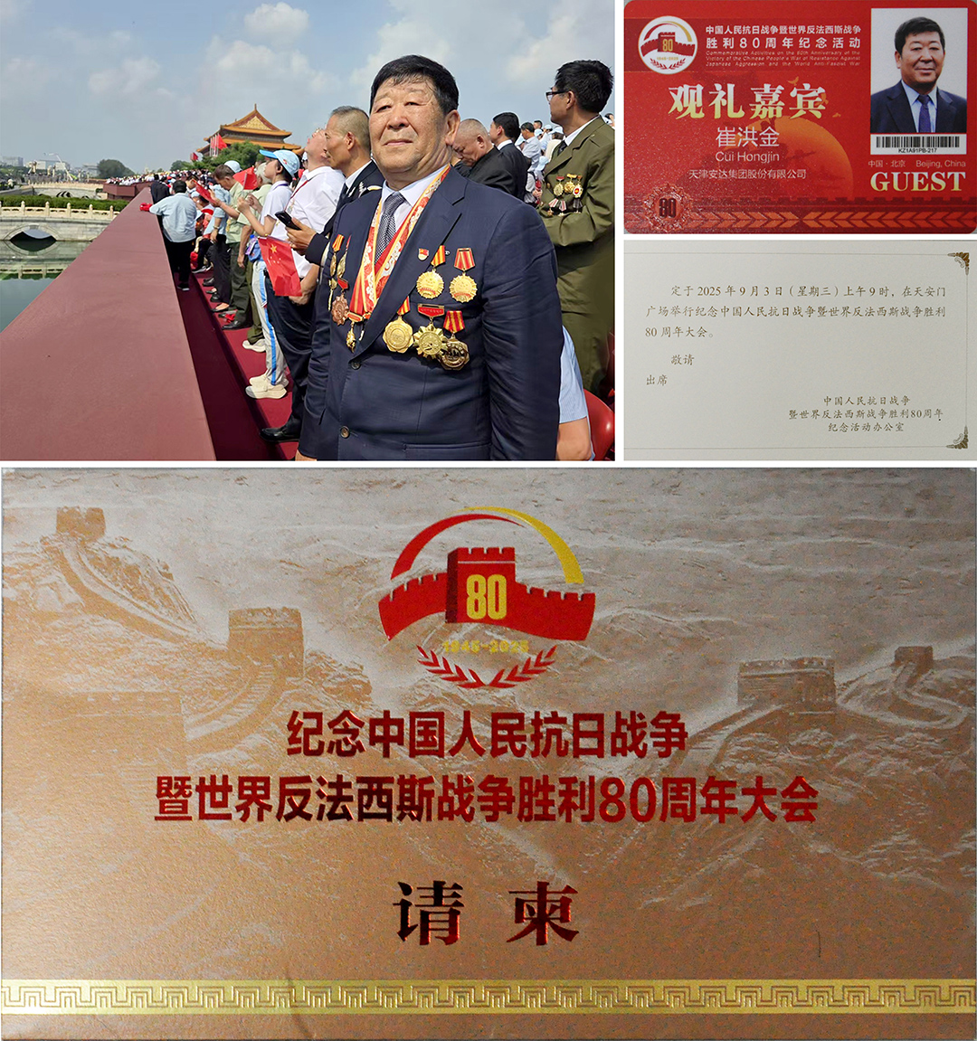 2025 年 9 月 3 日,天安門廣場旌旗獵獵、號角嘹亮,中國人民抗日戰(zhàn)爭暨世界反法西斯戰(zhàn)爭勝利 80 周年閱兵式在此隆重舉行。安達集團黨委書記、董事長崔洪金作為全國最美擁軍人物代表受邀出席,在現(xiàn)場見證這一彰顯國威軍威的歷史性時刻。
