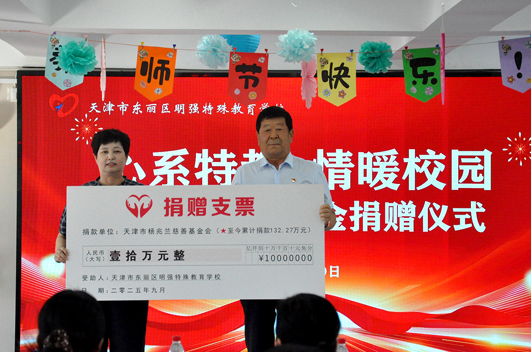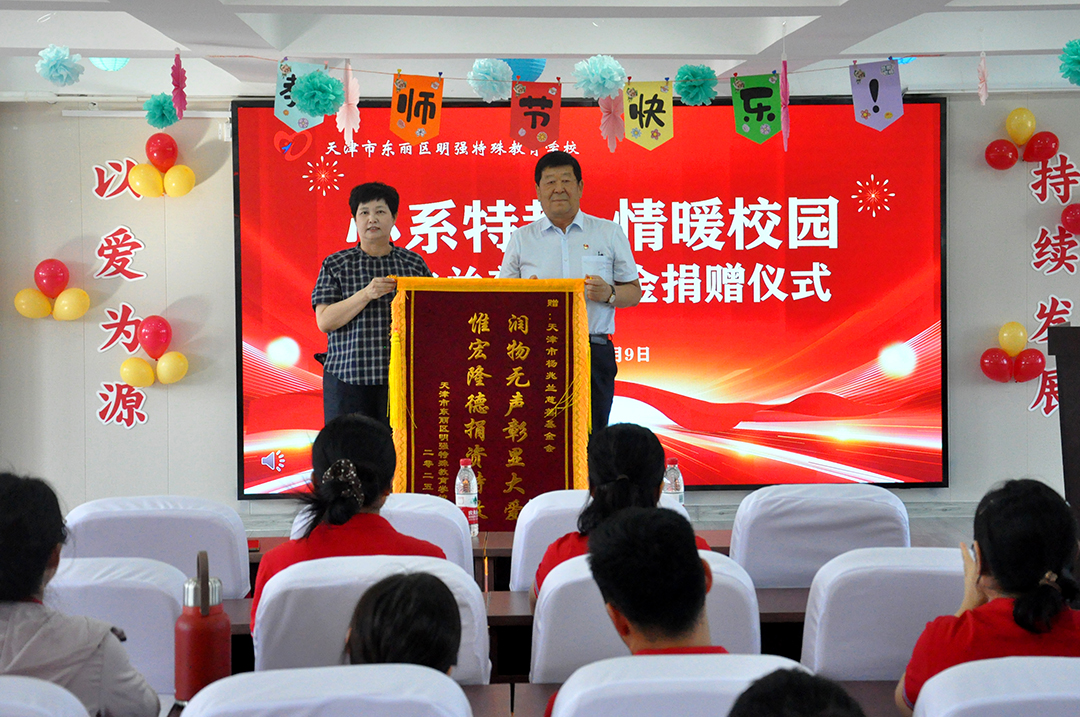 隨后的捐贈儀式上,崔洪金代表天津市楊兆蘭慈善基金會,將 10 萬元教師專項改善資金交付明強特殊教育學校校長尚俊歆手上。尚校長表示該筆資金將精準用于教師發(fā)展基金,支持教師參與特教專業(yè)培訓、教研交流活動,為教師成長賦能。為表感謝,尚校長向崔洪金董事長贈送錦旗。