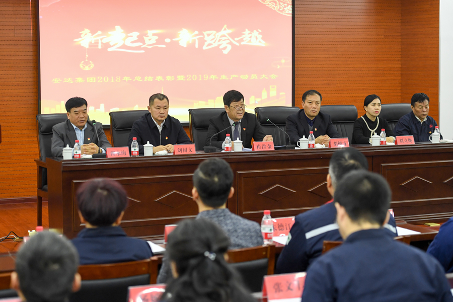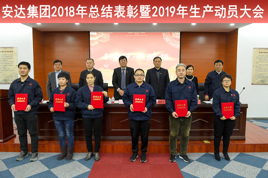 2019年1月12日上午,時(shí)值安達(dá)集團(tuán)成立31周年的喜慶節(jié)日,集團(tuán)六層道德講堂張燈結(jié)彩、士氣高昂,安達(dá)集團(tuán)2018年度工作總結(jié)表彰暨2019年度生產(chǎn)動(dòng)員大會(huì)在這里勝利召開。安達(dá)集團(tuán)黨委書記董事長(zhǎng)崔洪金、東麗區(qū)工商聯(lián)黨組副書記劉樹義、豐年村街道黨委書記胡德方、區(qū)總工會(huì)副主席劉立煥及集團(tuán)各分公司相關(guān)領(lǐng)導(dǎo)、優(yōu)秀員工代表齊聚一堂,大會(huì)以“新起點(diǎn)、新跨越”為主題,共同回顧了2018年度安達(dá)集團(tuán)的全面工作和所取得的成績(jī),并就工作中所涌現(xiàn)出的先進(jìn)集體、個(gè)人進(jìn)行了表彰,同時(shí)部署了新一年的工作方向和任務(wù),并結(jié)合當(dāng)前政策、經(jīng)濟(jì)形勢(shì)對(duì)集團(tuán)的發(fā)展做出了規(guī)劃和展望。會(huì)議由安達(dá)集團(tuán)黨委辦公室主任曹永海主持,工會(huì)主席鄭寶彥宣讀獲獎(jiǎng)名單。